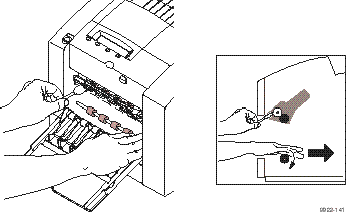 Note: Once the maintenance tray has been partially used, it leaks drum fluid if tipped. Contact with the drum fluid poses no known health risk; refer to MSDS for silicone oil (drum fluid) for more information. Locate the two sets of upper paper-feed rollers above the maintenance tray: One set of rollers is black rubber; the other set is white plastic. Turning the lower rubber rollers also turns the upper rollers.